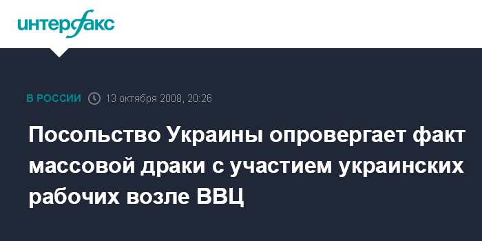 Москва. 13 октября. INTERFAX.RU - Посольство Украины в России опровергает факт широкомасштабной драки при участии украинских рабочих возле Всероссийского выставочного центра в Москве, сообщает пресс-служба украинского МИД в понедельник.