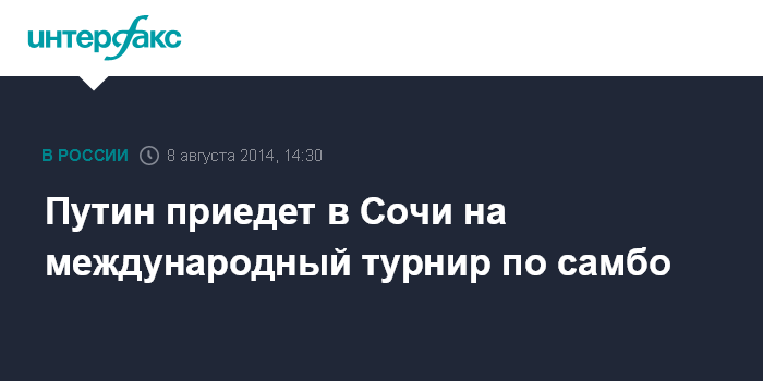 Москва. 8 августа. INTERFAX.RU - Президент России Владимир Путин в субботу посетит в Сочи турнир по боевому самбо "ПЛАТФОРМА S-70", сообщает пресс-служба главы государства.