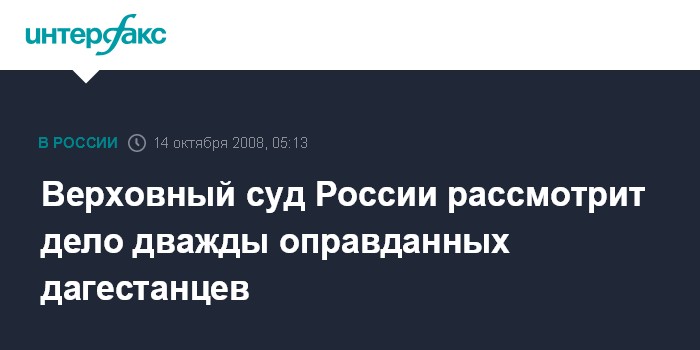 Москва. 14 октября. ИНТЕРФАКС - Верховный суд РФ в третий раз рассмотрит протест прокуратуры на оправдательный приговор отношении четырех обвиняемых по делу о покушении на главу дагестанского отделения Пенсионного фонда России Амучи Амутинова.