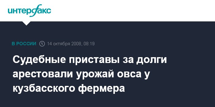 Москва. 14 октября. INTERFAX.RU - Кузбасские судебные приставы за долги арестовали у фермера Гурьевского района Кемеровской области 900 тонн овса урожая нынешнего года.