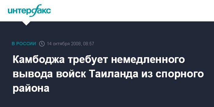 Москва. 14 октября. INTERFAX.RU - Премьер-министр Камбоджи Хун Сен потребовал от Таиланда немедленно вывести войска со спорного участка границы. Таиланду направлен ультиматум, в котором эту страну призывают отвести войска с границы во вторник до полудня (по местному времени).