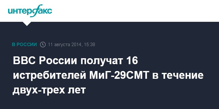 Ранее сообщалось, что госконтракт на поставку ВВС России 16 многоцелевых истребителей МиГ-29СМТ был подписан в апреле этого года. Самолеты будут переданы ВВС России до конца 2016 года. Сумма контракта, включая средства наземного обслуживания и контрольно-проверочной аппаратуры, составляет более 17 млрд рублей.