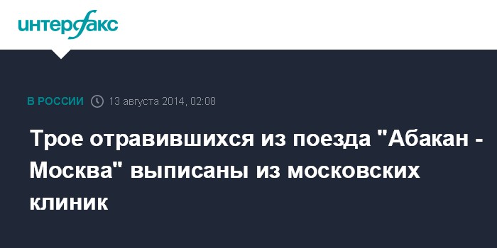 Москва. 13 августа. INTERFAX.RU - Трое взрослых, отравившихся в поезде "Абакан - Москва", выписаны из столичных клиник, сообщил "Интерфаксу" источник в медицинских кругах.
