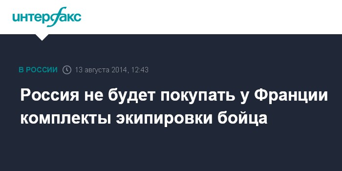 Москва. 13 августа. INTERFAX.RU - Россия не планирует закупать у Франции комплекты экипировки бойца, заявил журналистам глава делегации "Рособоронэкспорта" на выставке "Оборонэкспо-2014" в подмосковном Жуковском Игорь Севастьянов.