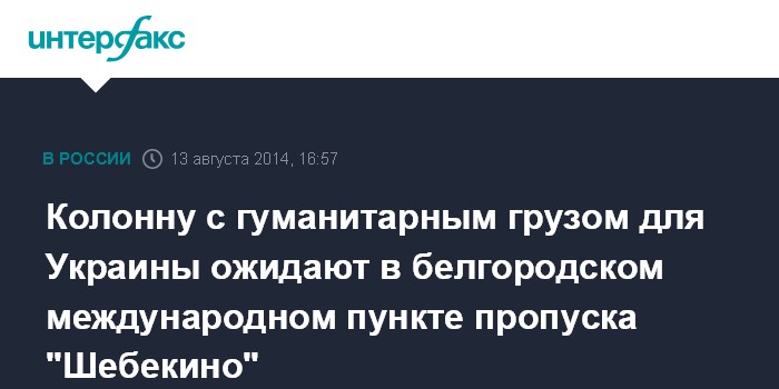 Москва. 13 августа. INTERFAX.RU - Как ожидается, колонна с гуманитарной помощью для юго-восточных регионов Украины прибудет в международный пункт пропуска "Шебекино" в Белгородской области.