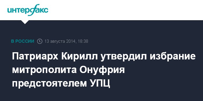 Москва. 13 августа. INTERFAX.RU - Патриарх Московский и всея Руси Кирилл утвердил решение Собора епископов Украинской православной церкви об избрании митрополита Онуфрия ее предстоятелем, сообщила в среду вечером пресс-служба патриарха.