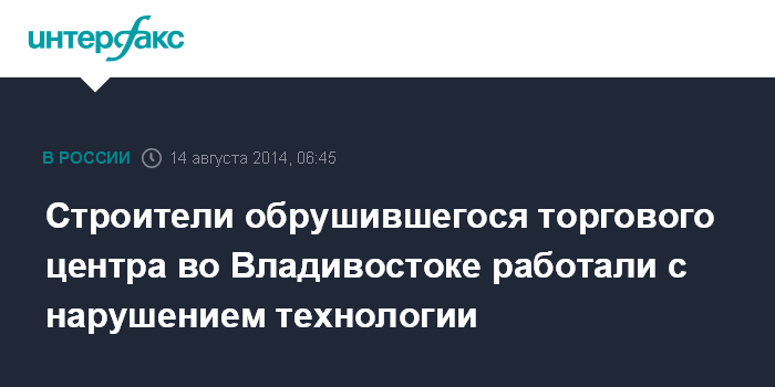 Москва. 14 августа. INTERFAX.RU - Техническая комиссия назвала предварительную причину обрушения строящегося торгово-выставочного центра во Владивостоке, в результате которого в среду пострадали четверо рабочих.