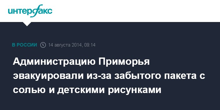 Москва. 14 августа. INTERFAX.RU - Сотрудники администрации Приморья, эвакуированные из-за подозрительного бесхозного пакета у входа в здание, вернулись на рабочие места. Осмотр обнаружил, что в пакете были детские рисунки и коробка с солью, скорее всего, забытые кем-то из посетителей, сообщил "Интерфаксу" источник в силовых структурах.