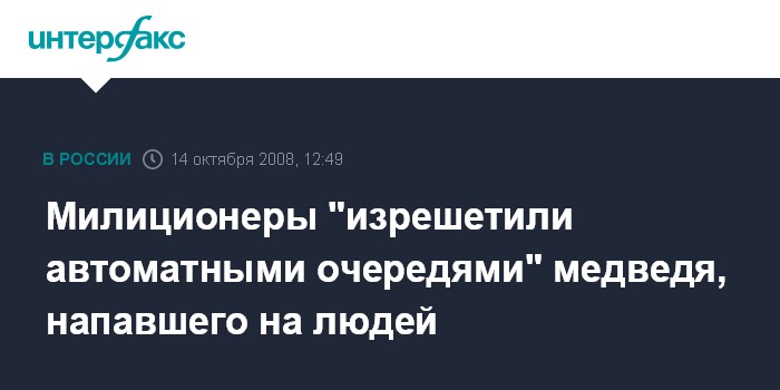 Иркутск. 14 октября. INTERFAX.RU - В Иркутской области сотрудникам Мамско-Чуйской милиции пришлось застрелить крупного медведя, напавшего на людей. Как сообщает пресс-служба местного ГУВД, в понедельник в РОВД поступило телефонное сообщение от женщины, просившей о помощи - на нее с мужем напал медведь.
