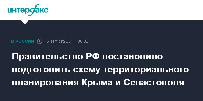"Подготовить схему территориального планирования Российской Федерации применительно к территориям Республики Крым и г. Севастополя в отношении областей федерального транспорта (железнодорожного, воздушного, морского, внутреннего водного, трубопроводного транспорта), автомобильных дорог федерального значения, энергетики, высшего образования и здравоохранения", - говорится в тексте постановления, размещенного на сайте правительства РФ.