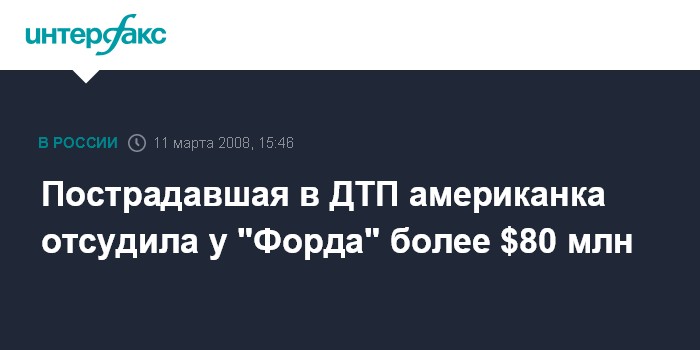 Лос-Анджелес. 11 марта. INTERFAX.RU - Окружной апелляционный суд в Калифорнии постановил взыскать $82,6 с автомобилестроительной компании Ford Motor в пользу Бенетты Бьюэлл-Уилсон, которая попала в аварию. Об этом сообщает сайт юридических новостей law.com.