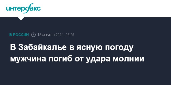Москва. 18 августа. INTERFAX.RU - В Забайкальском крае на берегу озера Содовое в безоблачную погоду от удара молнии погиб мужчина. Об этом сообщает пресс-служба краевого управления МВД.