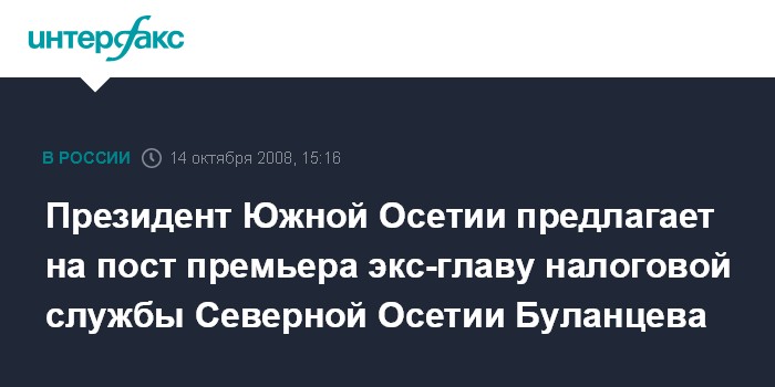 Москва. 14 октября. INTERFAX.RU - Президент Южной Осетии Эдуард Кокойты предложил парламенту утвердить в должности премьер-министра республики Асламбека Буланцева, ранее занимавшего должность главы Федеральной налоговой службы по Северной Осетии. Кандидатуру Буланцева Кокойты предложил на встрече с депутатами во вторник.