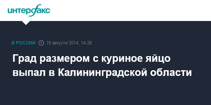 Москва. 18 августа. INTERFAX.RU - В Зеленоградском районе Калининградской области в минувшие выходные во время грозы выпал крупный град. Как сообщили "Интерфаксу" жители поселка Сосновка, размер отдельных градин достигал небольшого куриного яйца.