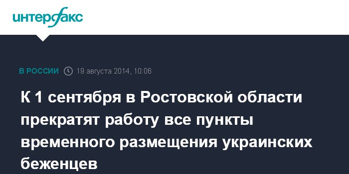 Москва. 19 августа. INTERFAX.RU - Все полевые пункты временного размещения (ППВР) украинских беженцев в Ростовской области будут ликвидированы к 1 сентября, сообщили "Интерфаксу" во вторник в областном правительстве. Сейчас в регионе остаются три таких пункта.