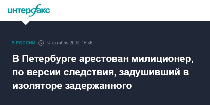 Москва. 14 октября. INTERFAX.RU - В Петербурге по обвинению в убийстве задержанного в изоляторе арестован транспортный милиционер, сообщили "Интерфаксу" в Северо-Западной транспортной прокуратуре.