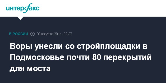 Москва. 20 августа. INTERFAX.RU - Грабители в Подмосковье совершили налет на стройплощадку и похитили металлические перекрытия для пешеходного моста, сообщили "Интерфаксу" в пресс-центре МВД России.
