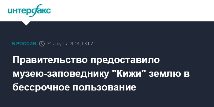 Москва. 24 августа. INTERFAX.RU - Председатель правительства РФ Дмитрий Медведев подписал распоряжение, в соответствии с которым земельный участок в урочище Середка Медвежьегорского района Республики Карелия передается музею-заповеднику "Кижи" в постоянное пользование.