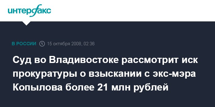 Владивосток. 15 октября. ИНТЕРФАКС-ДАЛЬНИЙ ВОСТОК - Советский районный суд Владивостока в среду рассмотрит иск прокуратуры города о взыскании с экс-мэра Юрия Копылова 21,5 млн рублей в бюджет муниципалитета.
