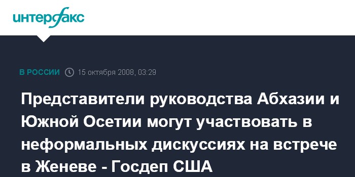 Вашингтон. 15 октября. ИНТЕРФАКС - Госдеп США подтвердил присутствие представителей Абхазии Южной Осетии на переговорах в Женеве. Об этом говорится в специальном сообщении американского дипведомства, распространенного в среду вечером в американской столице.