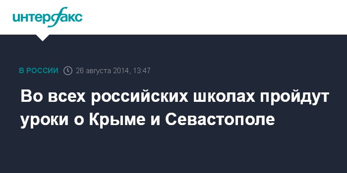 Москва. 26 августа. INTERFAX.RU - Уроки, посвященные воссоединению Крыма и Севастополя с Россией, пройдут в этом году во всех школах страны, сообщил министр образования и науки РФ Дмитрий Ливанов.