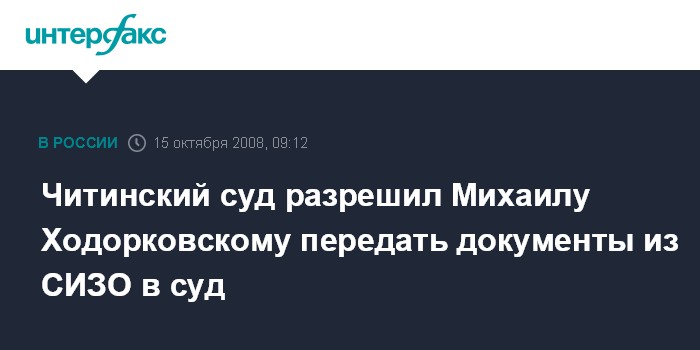 Москва. 15 октября. INTERFAX.RU - Читинский областной суд при рассмотрении кассационной жалобы адвокатов на отказ экс-главе НК "ЮКОС" Михаилу Ходорковскому в условно-досрочном освобождении разрешил ему передать из СИЗО пакет документов.