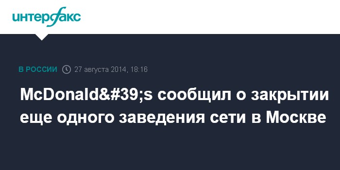 20 августа Роспотребнадзор приостановил работу трех предприятий быстрого питания McDonald's в Москве, включая первый российский ресторан сети, открывшийся на Пушкинской площади в 1990 году. Работа ресторанов была приостановлена после проверки, в ходе которой санитарная служба выявила многочисленные нарушения требований санитарного законодательства и законодательства о защите прав потребителей.