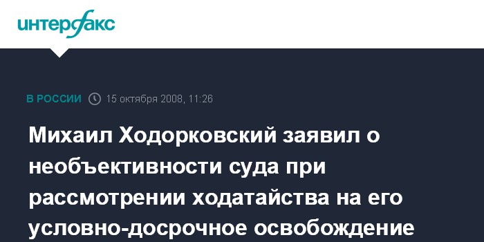 Москва. 15 октября. INTERFAX.RU - Экс-глава НК "ЮКОС" Михаил Ходорковский в среду на заседании суда по кассационной жалобе адвокатов на отказ в его условно-досрочном освобождении указал на необъективность суда первой инстанции.