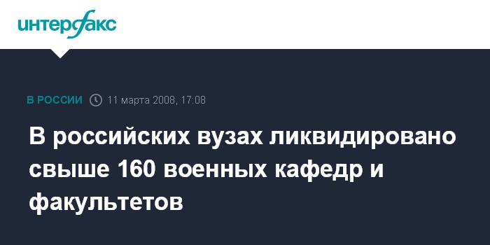 Одновременно ликвидированы 162 военных кафедры и факультета военного обучения в гражданских вузах, а также три кафедры военной и экстремальной медицины при государственных медицинских образовательных учреждениях дополнительного образования.