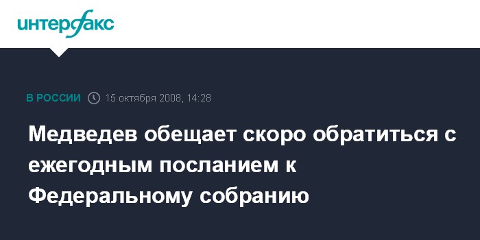 Москва. 15 октября. INTERFAX.RU - Президент России Дмитрий Медведев заявил, что в ближайшее время выступит с ежегодным посланием Федеральному собранию. "Послание президента Федеральному собранию состоится достаточно скоро", - сообщил Медведев в среду на заседании Совета при президенте РФ по науке, технологиям и образованию.