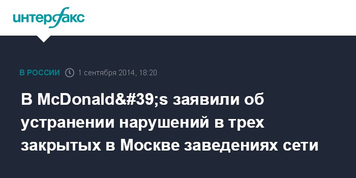 Москва. 1 сентября. INTERFAX.RU - McDonald's оперативно устранил большинство нарушений, выявленных специалистами Роспотребнадзора в трех московских заведениях сети на Проспекте Мира, Манежной площади и Бронной улице, деятельность которых была приостановлена по решению суда, сообщила "Интерфаксу" в понедельник директор по связям с общественностью "Макдоналдс-Россия" Светлана Полякова.