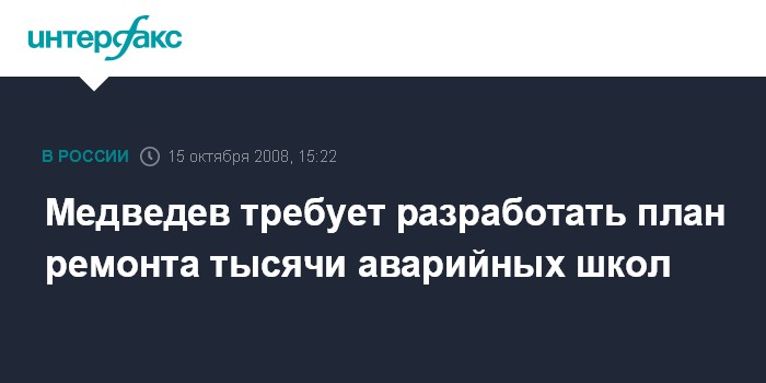 Москва. 15 октября. INTERFAX.RU - Президент РФ Дмитрий Медведев поручил в течение двух недель подготовить и доложить ему план по приведению тысячи школ, находящихся в аварийном состоянии, в надлежащий вид.