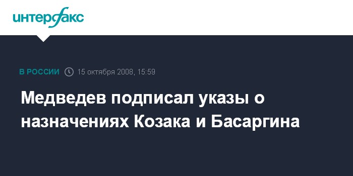 Кроме того, в сообщении говорится, что Медведев подписал указ о назначении Виктора Басаргина министром регионального развития РФ.
