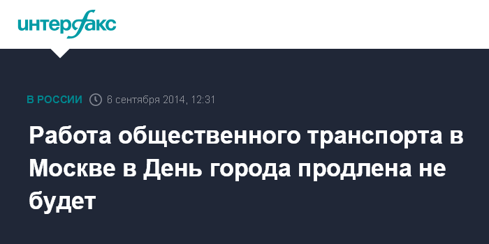 Москва. 6 сентября. INTERFAX.RU - Общественный транспорт в столице в День города в субботу будет работать в особом режиме, однако время работы продлеваться не будет, заявили "Интерфаксу" в департаменте транспорта и развития дорожно-транспортной инфраструктуры Москвы.
