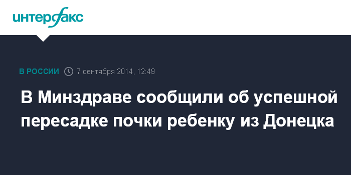 Москва. 7 сентября. INTERFAX.RU - Российские медики провели успешную операцию по пересадке почки ребенку из украинского Донецка, сообщил "Интерфаксу" в воскресенье пресс-секретарь Минздрава России Олег Салагай.