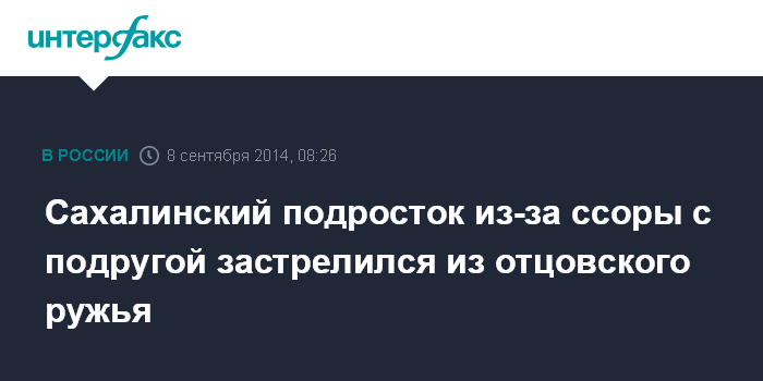 Москва. 8 сентября. INTERFAX.RU - Жители Невельска (Сахалин) днем в воскресенье обнаружили тело погибшего 14-летнего подростка с огнестрельным ранением в голову.