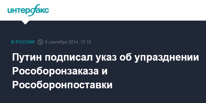 Москва. 8 сентября. INTERFAX.RU - Президент России Владимир Путин подписал указ об упразднении Федерального агентства по поставкам вооружения, военной, специальной техники и материальных средств (Рособоронпоставка) и Федеральной службы по оборонному заказу (Рособоронзаказ), сообщила пресс-служба Кремля.