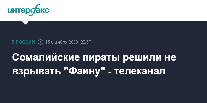 Йоханнесбург. 15 октября. ИНТЕРФАКС - Пираты, удерживающие украинское судно "Фаина" с грузом оружия у берегов Сомали, объявили в среду об отказе от плана подорвать его в случае невыплаты выкупа, передает южноафриканский информационный канал "Ньюз-24".