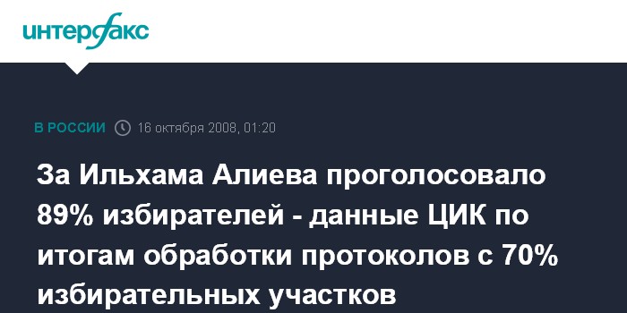 Баку. 16 октября. ИНТЕРФАКС-АЗЕРБАЙДЖАН - По первичным данным обработки протоколов с 70% избирательных участков на президентских выборах Азербайджана лидирует Ильхам Алиев, набравший 89,4% голосов избирателей, заявил на брифинге глава Центризбиркома страны Мазахир Панахов