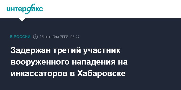 Хабаровск. 16 октября. ИНТЕРФАКС-ДАЛЬНИЙ ВОСТОК - Сотрудники дальневосточного ГУ МВД РФ задержали третьего из четырех участников разбойного нападения на инкассаторов "Росинкас" в 2006 году в Хабаровске, в ходе которого преступники похитили около 14,5 млн рублей, убив охранника.