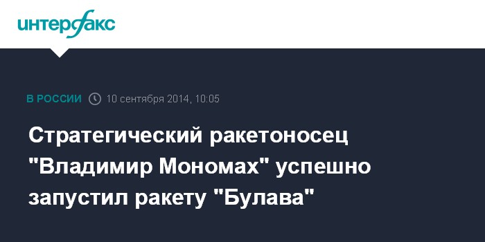 Москва. 10 сентября. INTERFAX.RU - Атомный ракетный подводный крейсер стратегического назначения проекта 955 ("Борей") - К-551 "Владимир Мономах" - успешно произвел в среду свой первый пуск межконтинентальной баллистической ракеты (МБР) "Булава" из акватории Белого моря по полигону Кура на Камчатке, сообщил журналистам официальный представитель Минобороны РФ генерал-майор Игорь Конашенков.