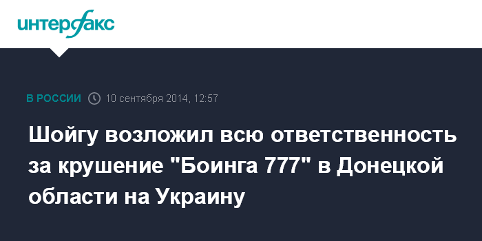 Москва. 10 сентября. INTERFAX.RU - Украина несет полную ответственность за катастрофу малайзийского "Боинга", произошедшую на востоке республики, заявил министр обороны РФ Сергей Шойгу в среду на встрече со своим коллегой из Малайзии Хишамуддином Хусейном.
