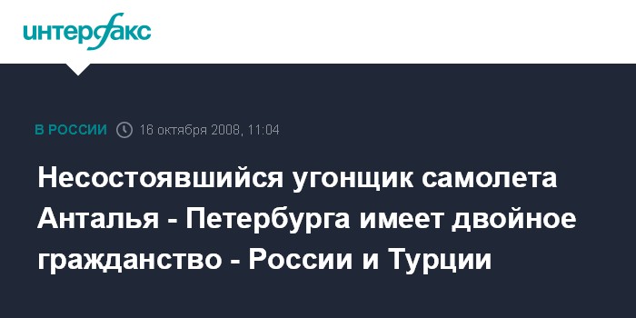 Москва. 16 октября. INTERFAX.RU - Задержанный за попытку захвата самолета Анталья - Петербург имеет двойное гражданство - российское и турецкое, говорится в сообщении пресс-службы Северо-Западной транспортной прокуратуры.