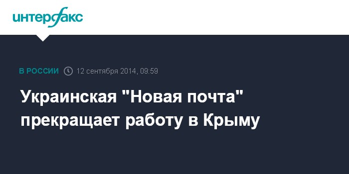 Москва. 12 сентября. INTERFAX.RU - Крупнейшая на Украине служба доставки "Новая почта" прекратила доставку в Крым и из Крыма, около 40 отделений "Новой почты" в регионе закрыты, сообщила "Интерфаксу" в пятницу сотрудница службы клиентской поддержки компании.