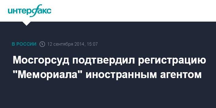 Москва. 12 сентября. INTERFAX.RU - Мосгорсуд в пятницу подтвердил законность требования столичной прокуратуры о регистрации правозащитного центра "Мемориал" в качестве иностранного агента. Как сообщили "Интерфаксу" в суде, жалоба "Мемориала" на решение Замоскворецкого суда Москвы отклонена.