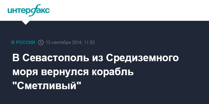 "Сегодня из длительного плавания в Севастополь вернулся сторожевой корабль (СКР) Черноморского флота "Сметливый". С 30 апреля 2014 года корабль под командованием капитана 2 ранга Андрея Зайцева выполнял задачи в составе постоянного соединения Военно-Морского Флота России в Средиземном море", - сказал Трухачев "Интерфаксу" в субботу.
