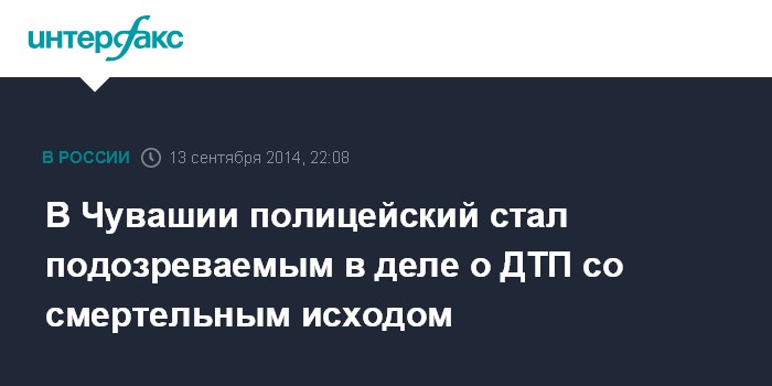 Москва. 13 сентября. INTERFAX.RU - Следственные органы Чувашии возбудили уголовное дело в отношении сотрудника управления МВД России по Чебоксарам, который подозревается в том, что по его вине в ДТП погиб человек.