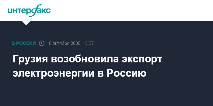 Тбилиси. 16 октября. INTERFAX.RU - Грузия возобновила экспорт электроэнергии в Россию, осуществлявшийся в рамках соглашения между знергосистемами двух стран, сообщили "Интерфаксу" в ООО "Коммерческий оператор электроэнергетической системы Грузии" (ESCO).