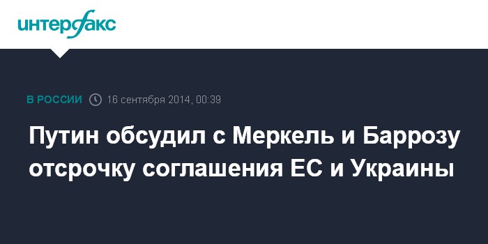 Телефонный разговор Путина с Меркель состоялся по инициативе немецкой стороны, отмечается в пресс-релизе. Лидеры дали позитивную оценку договоренности по отсрочке соглашения об ассоциации между ЕС и Украиной до 1 января 2016 г. Такая договоренность была достигнута 12 сентября на трехсторонних консультациях в Брюсселе, следует из сообщения.