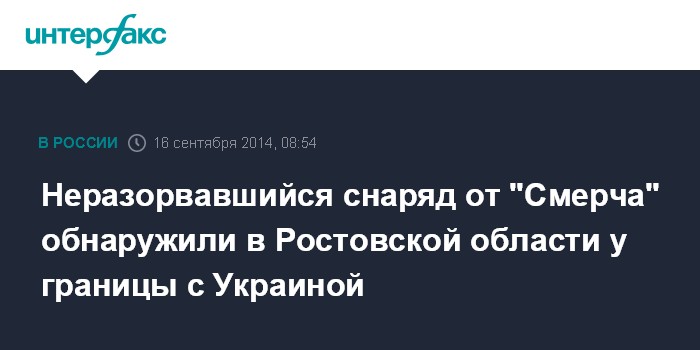 Москва. 16 сентября. INTERFAX.RU - В Тарасовском районе Ростовской области совсем рядом с российско-украинской границей накануне обнаружили неразорвавшийся снаряд от системы залпового огня "Смерч", сообщили в пресс-службе регионального департамента по предупреждению и ликвидации ЧС.